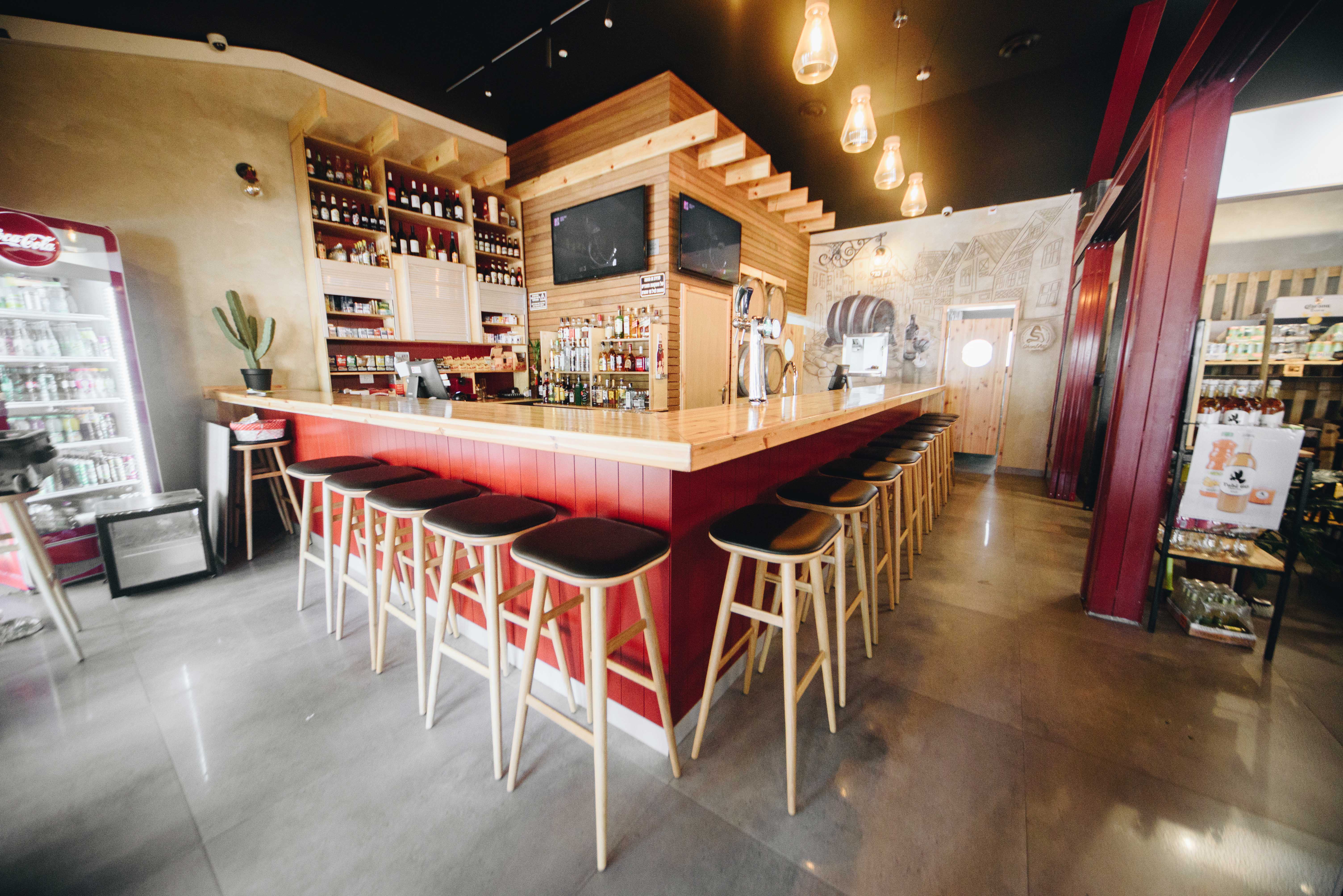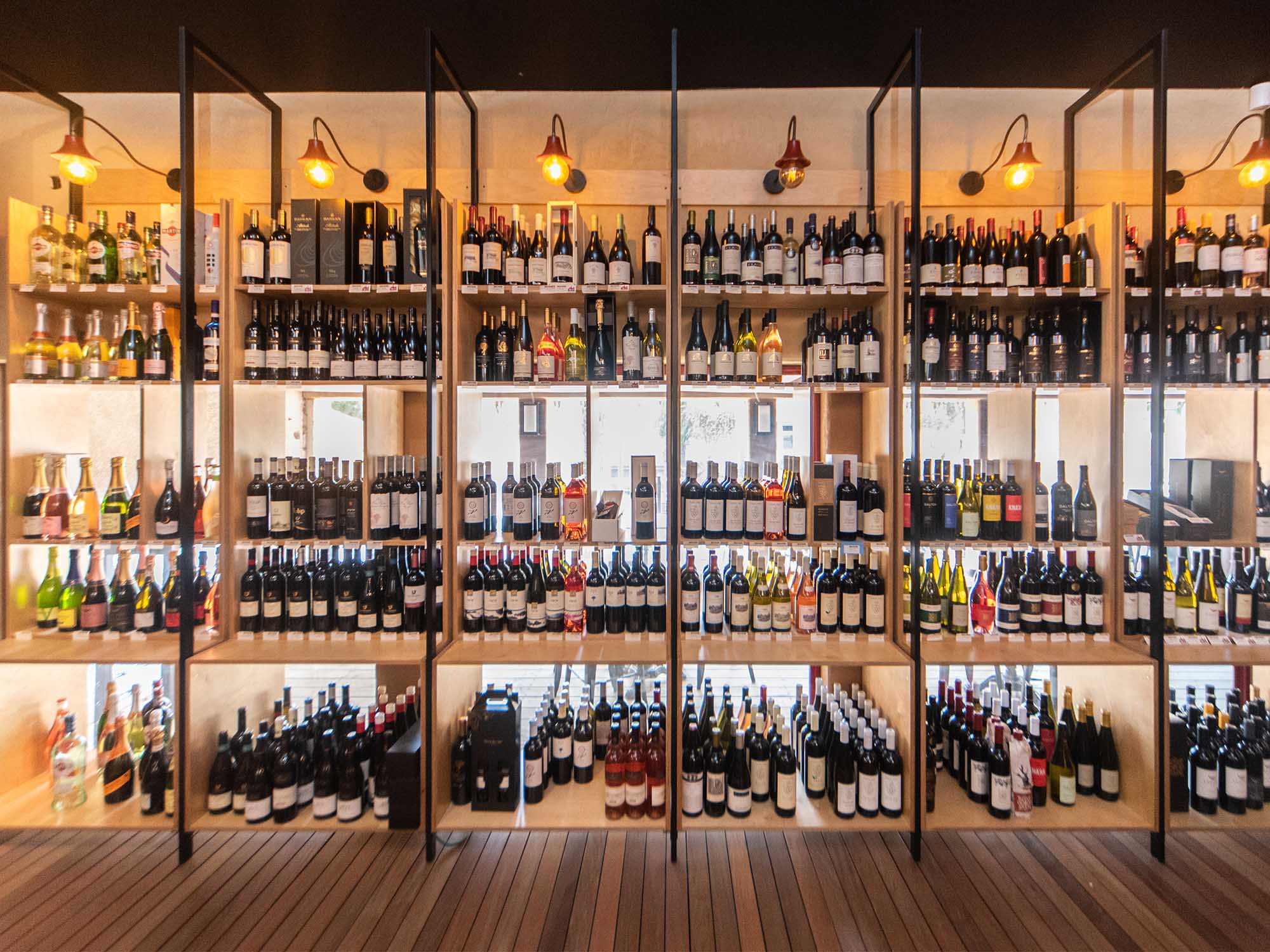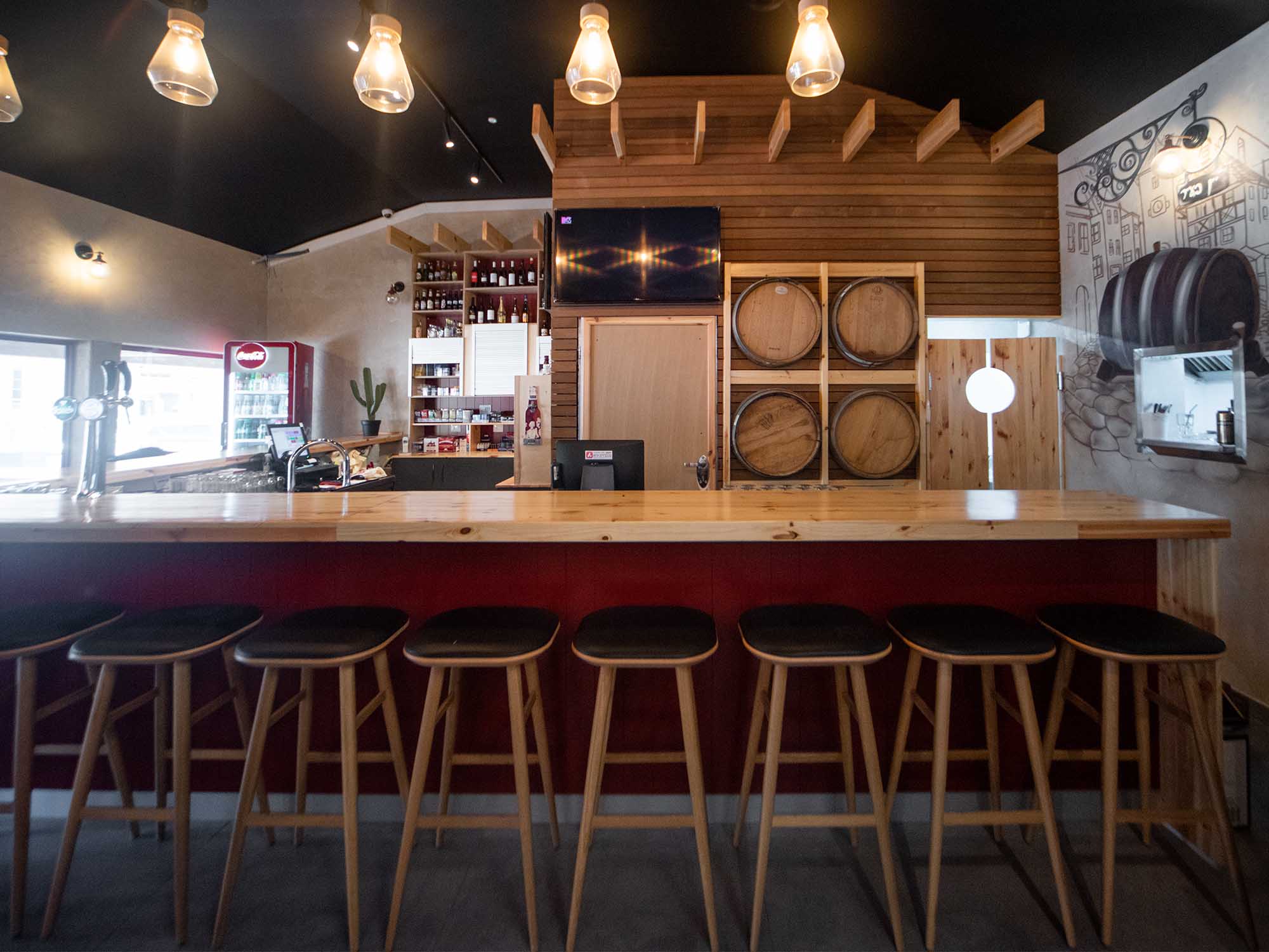 הסניף מחולק לשני חללים עיקריים – החנות המאפשרת הצגה נקייה וברורה של בקבוקי היין והאלכוהול, והבר המעניק חווית טעימה אישית ונעימה יותר.